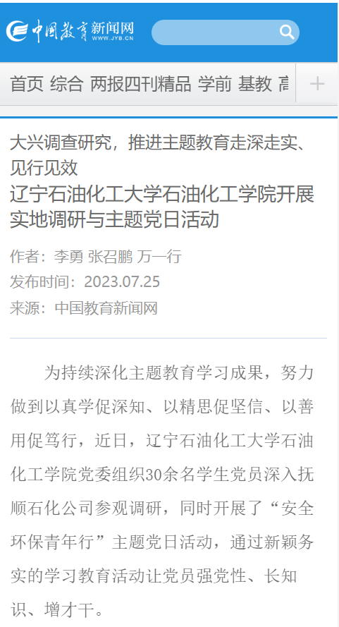 编者按:近日,中国教育新闻网对我校石油化工学院党委组织30余名学生党员深入抚顺石化公司参观调研,同时开展了“安全环保青年行”主题党日活动,通过新颖务实的学习教育活动让党员强党性、长知识、增才干进行了宣传报道。现将相关报道转载如下: