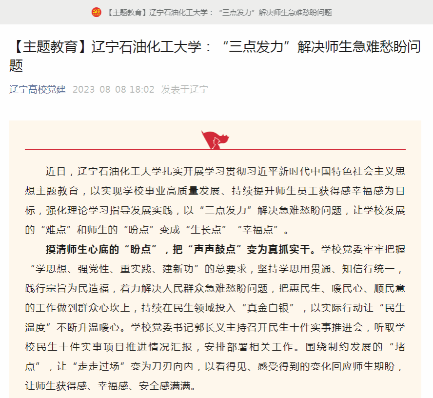 编者按:近日,辽宁高校党建微信公众号、辽宁日报·北国号等媒体平台对我校扎实开展主题教育,以实现学校事业高质量发展、持续提升师生员工获得感幸福感为目标,强化理论学习指导发展实践,以“三点发力”解决急难愁盼问题,让学校发展的“难点”和师生的“盼点”变成“生长点”“幸福点”进行了宣传报道,该文由赵志添、左浩淼老师撰写。现将相关报道转载如下: