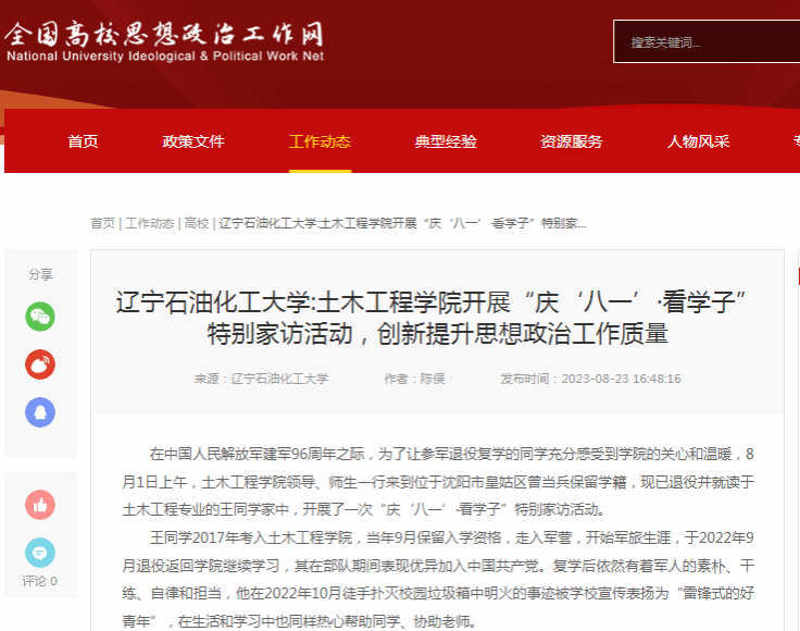 编者按:近日,全国高校思想政治工作网、辽宁日报·北国号等媒体平台对我校土木工程学院领导、师生一行到位于沈阳市皇姑区曾当兵保留学籍,现已退役并就读于土木工程专业的王同学家中,开展了一次“庆‘八一’·看学子”特别家访活动进行了宣传报道。现将相关报道转载如下: