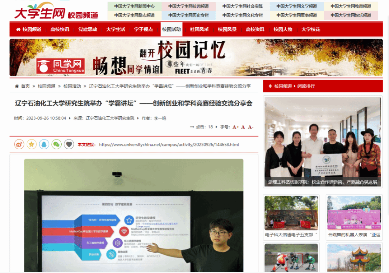 编者按:近日,中国大学生网对我校研究生院团委举办“学霸讲坛”——创新创业大赛和学科竞赛经验交流分享会进行了宣传报道。现将相关报道转载如下: