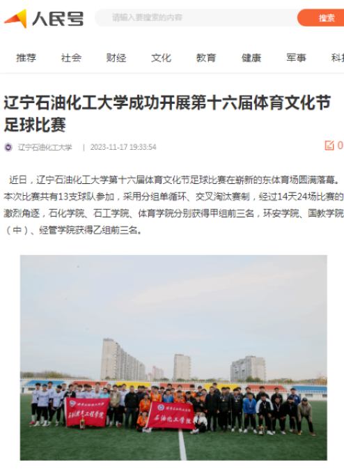 编者按:近日,学习强国辽宁学习平台、人民日报客户端·人民号、辽宁日报·辽望号、中国大学生网对我校成功开展第十六届体育文化节足球比赛进行了宣传报道。现将相关报道转载如下: