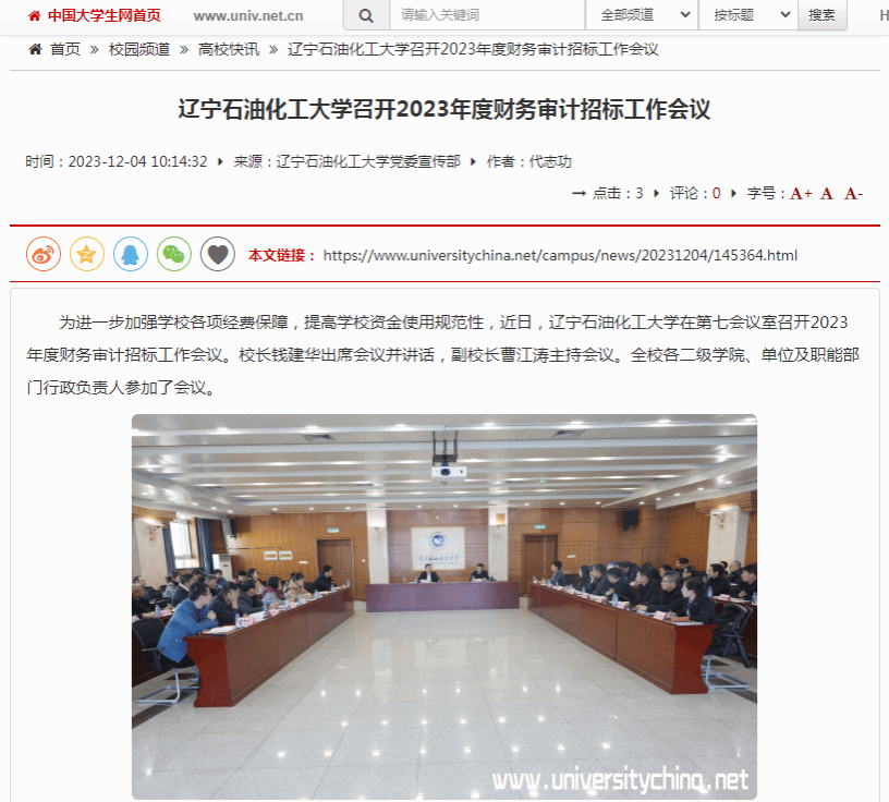编者按:近日,中国大学生网、辽宁日报·辽望号、人民日报客户端·人民号对我校为进一步加强学校各项经费保障,提高学校资金使用规范性,在第七会议室召开2023年度财务审计招标工作会议进行了宣传报道。现将相关报道转载如下: