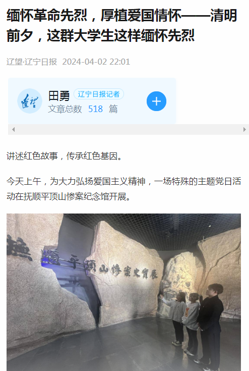 编者按:4月2日,为大力弘扬爱国主义精神,经济管理学院工程管理专业本科生党支部与工商管理专业本科生党支部的28名师生在抚顺平顶山惨案纪念馆开展一场特殊的主题党日活动。辽望·辽宁日报对此进行了宣传报道。现将相关报道转载如下:
