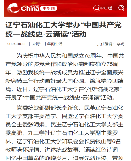 编者按:近日,中华网对我校党委统战部举办“中国共产党统一战线史·云诵读”活动进行了宣传报道。现将相关报道转载如下: