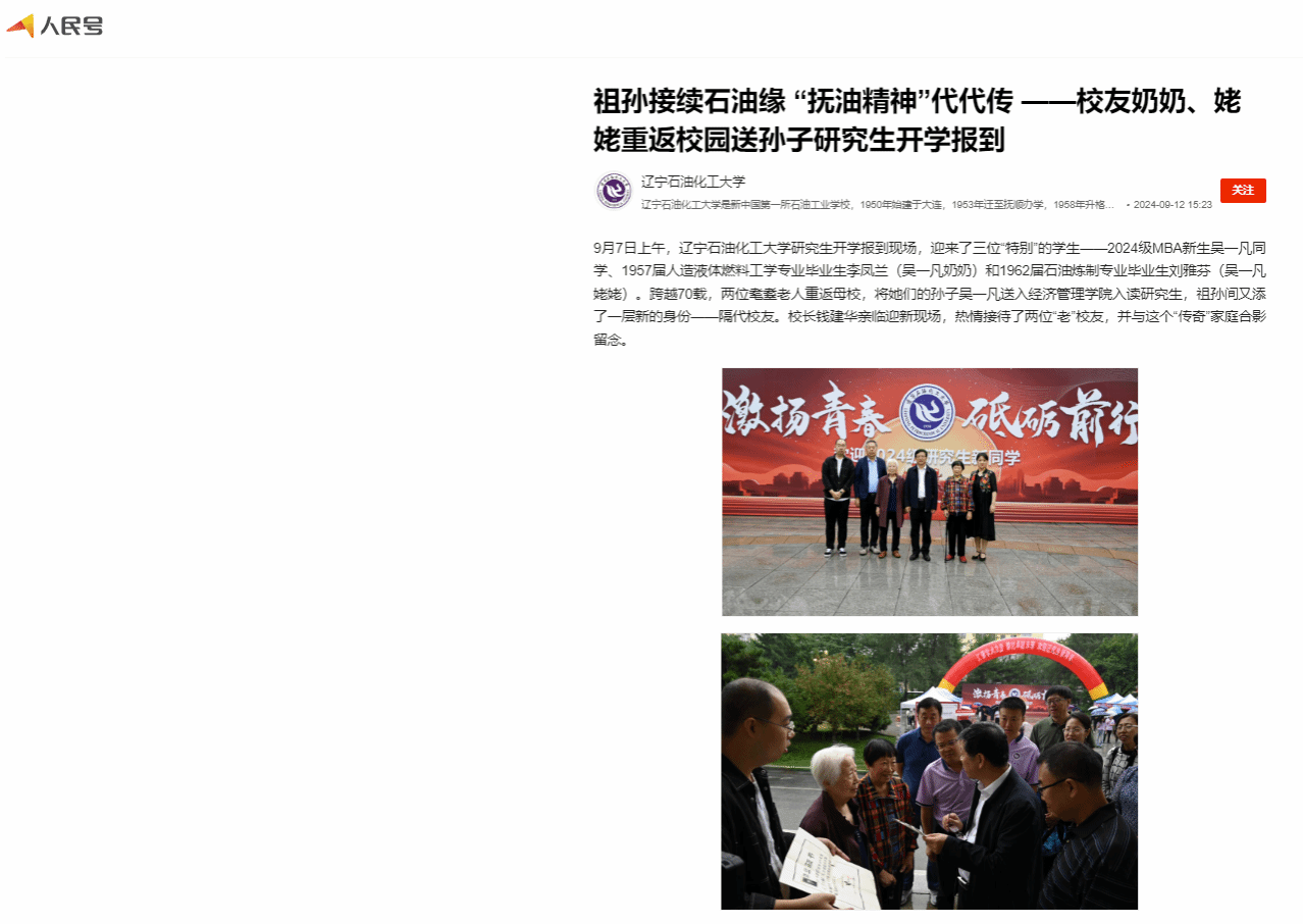 中国大学生网、人民日报客户端•人民号、搜狐号:祖孙接续石油缘 “抚油精神”代代传 ——校友奶奶姥姥重返校园送孙子开学报到