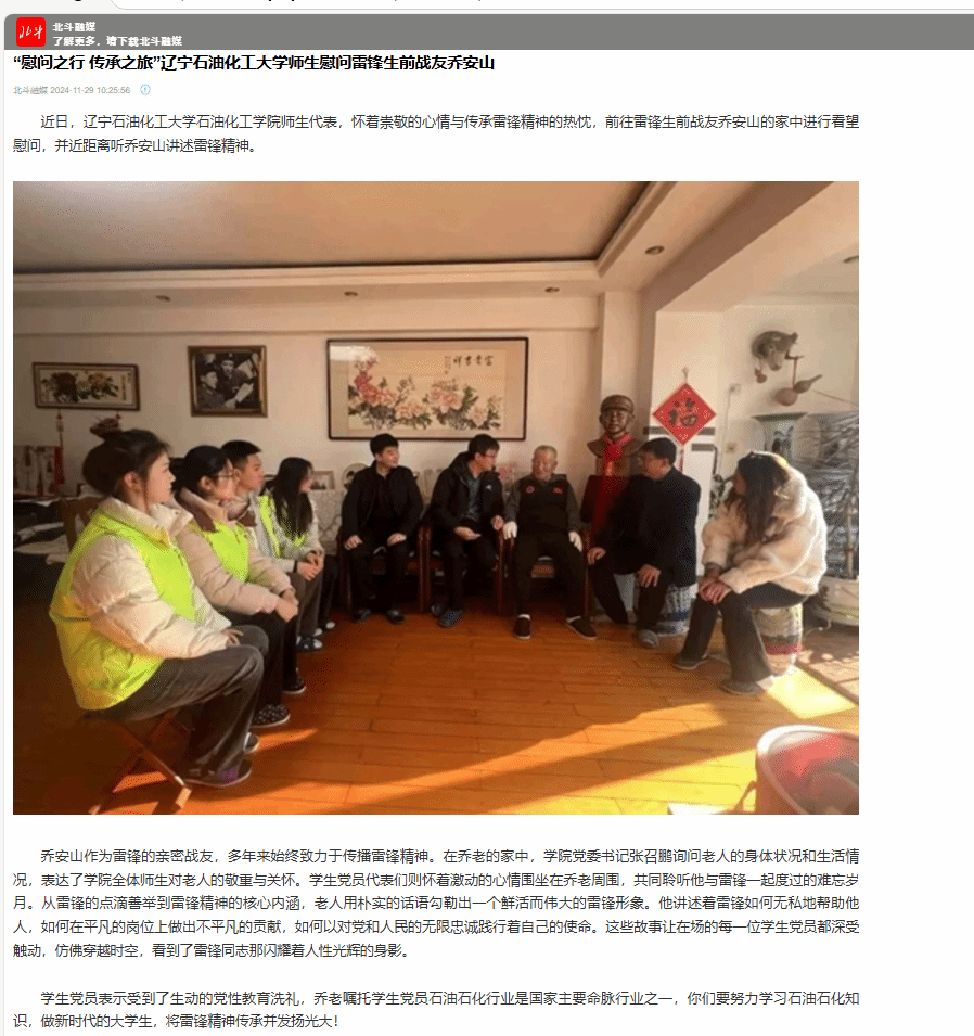 编者按:近日,石油化工学院师生代表,怀着崇敬的心情与传承雷锋精神的热忱,前往雷锋生前战友乔安山的家中进行看望慰问,并近距离听乔安山讲述雷锋精神。11月29日,北斗融媒对此进行了报道,现将相关报道转载如下: