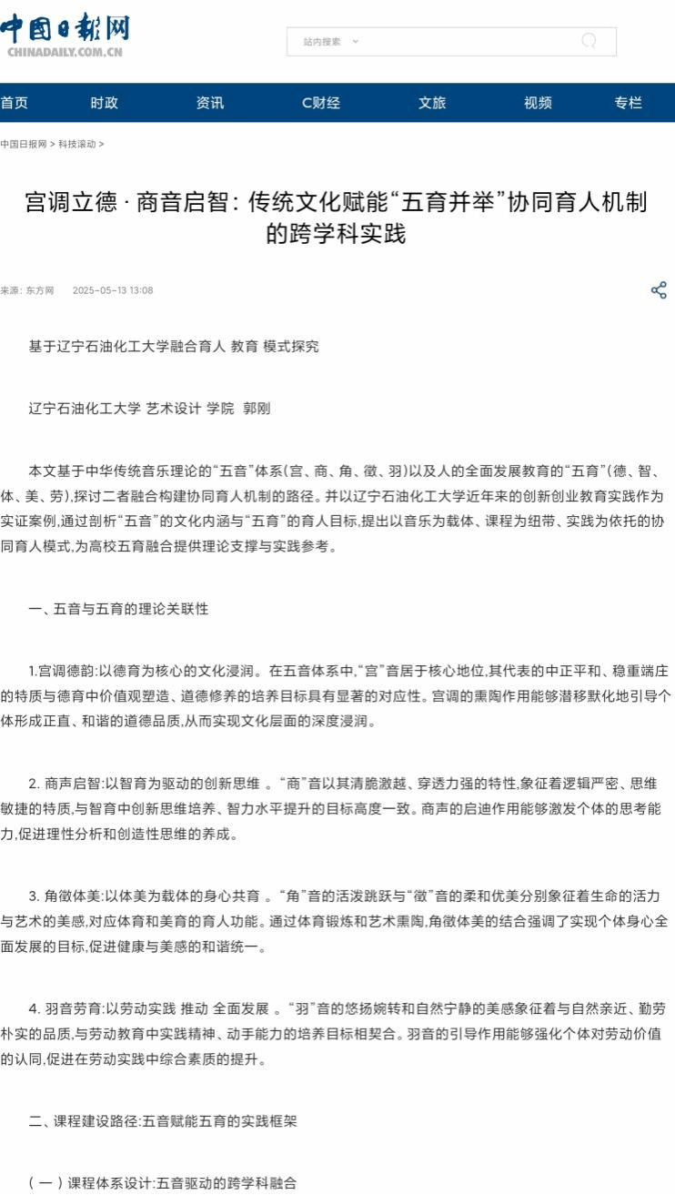 编者按:近日,我校艺术设计学院郭刚老师撰写的文章《宫调立德·商音启智:传统文化赋能“五育并举”协同育人机制的跨学科实践》在中国日报网发表。现将相关报道转载如下: