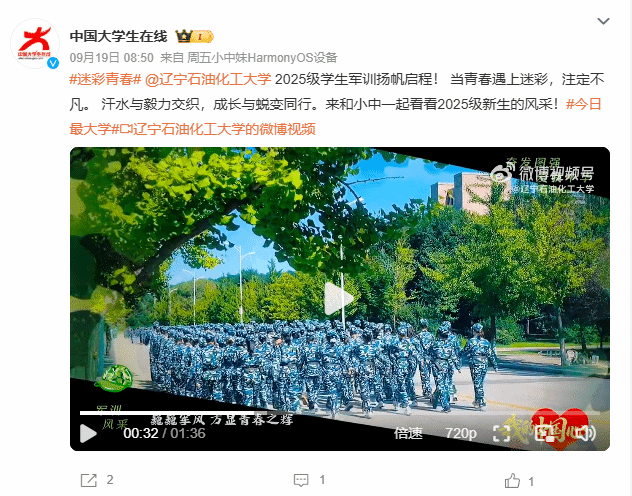 编者按:2025级学生军训扬帆启程! 当青春遇上迷彩,注定不凡。 汗水与毅力交织,成长与蜕变同行。教育部中国大学生在线官方微博对我校制作的学子军训视频进行了宣传报道。现将相关报道转载如下: