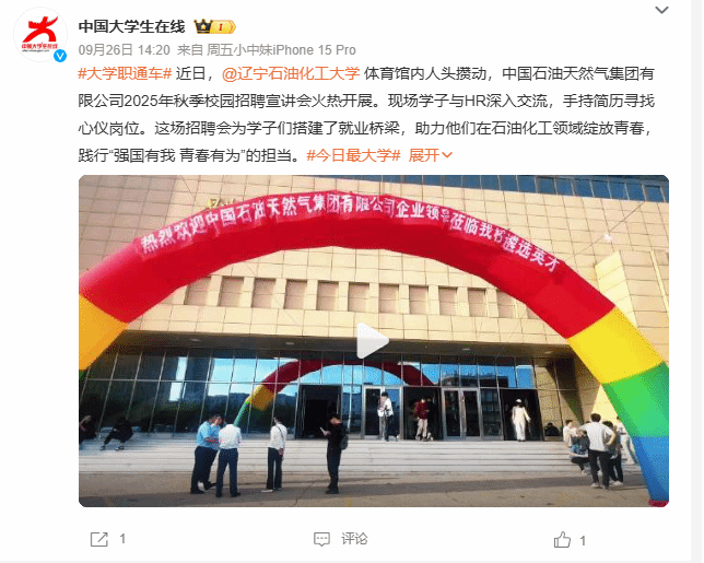 编者按:近日,学校体育馆内人头攒动,中国石油天然气集团有限公司2025年秋季校园招聘宣讲会火热开展。现场学子与HR深入交流,手持简历寻找心仪岗位。这场招聘会为学子们搭建了就业桥梁,助力他们在石油化工领域绽放青春,践行“强国有我 青春有为”的担当。教育部中国大学生在线官方微博对此进行了宣传报道。现将相关报道转载如下: