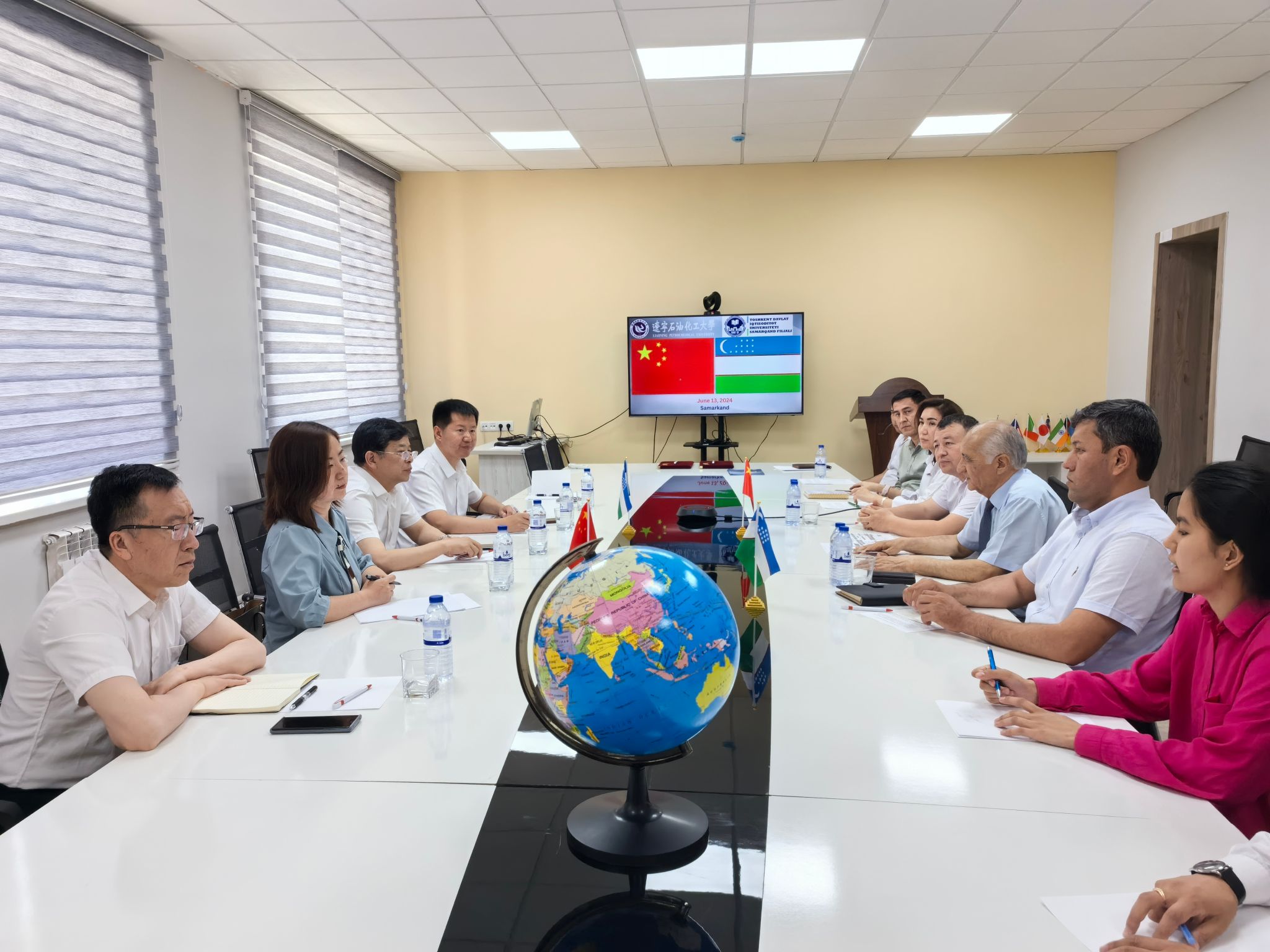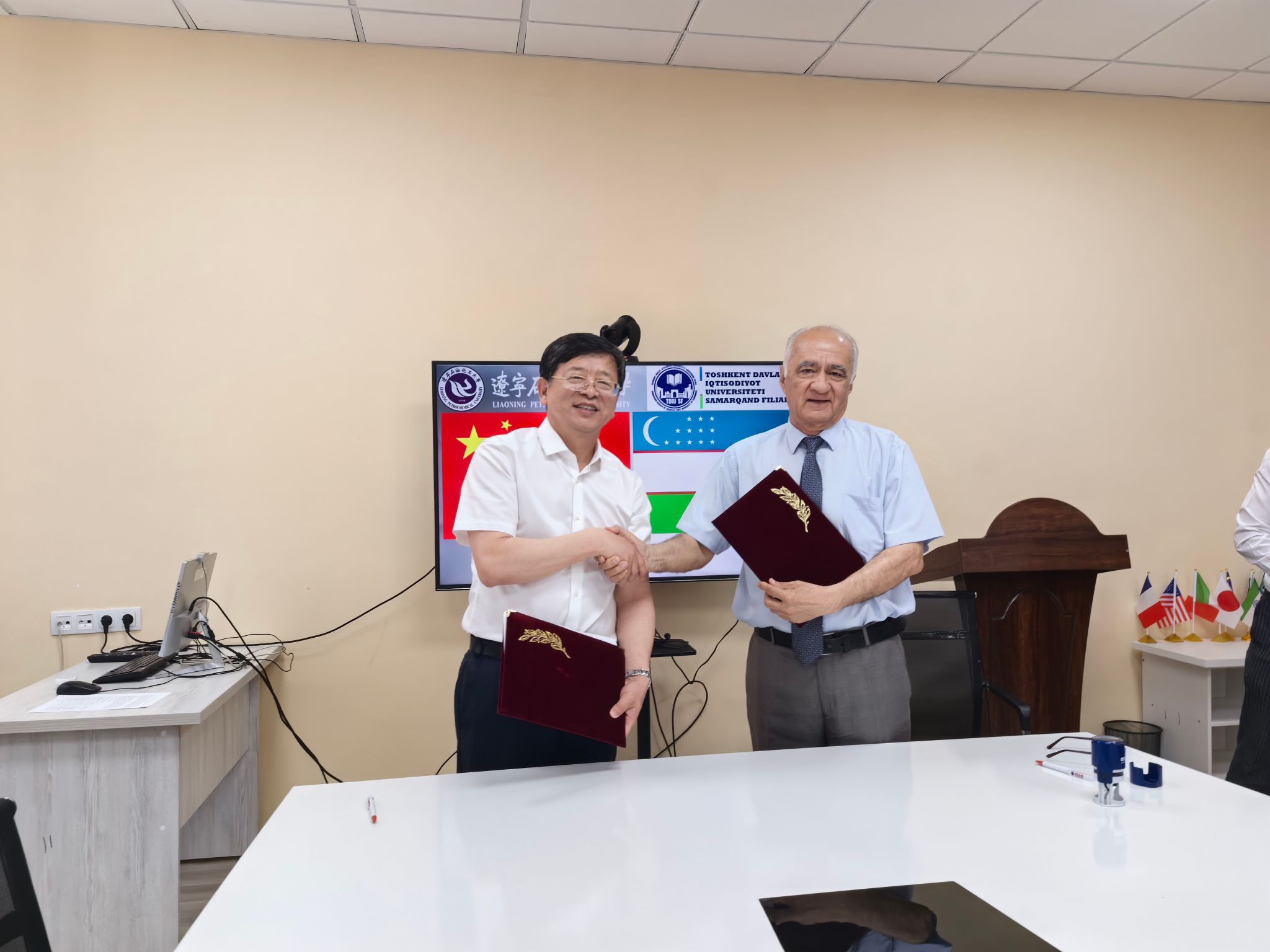 塔什干国立经济大学撒马尔罕分校校长Olim Murtazaev热情接待我校代表团。在两校友好合作交流会上,双方介绍了各自学校情况,并就合作办学、学生交流、教师互访及科研合作等事宜展开深入探讨。双方在多领域达成合作共识的基础上,共同签署了合作备忘录。